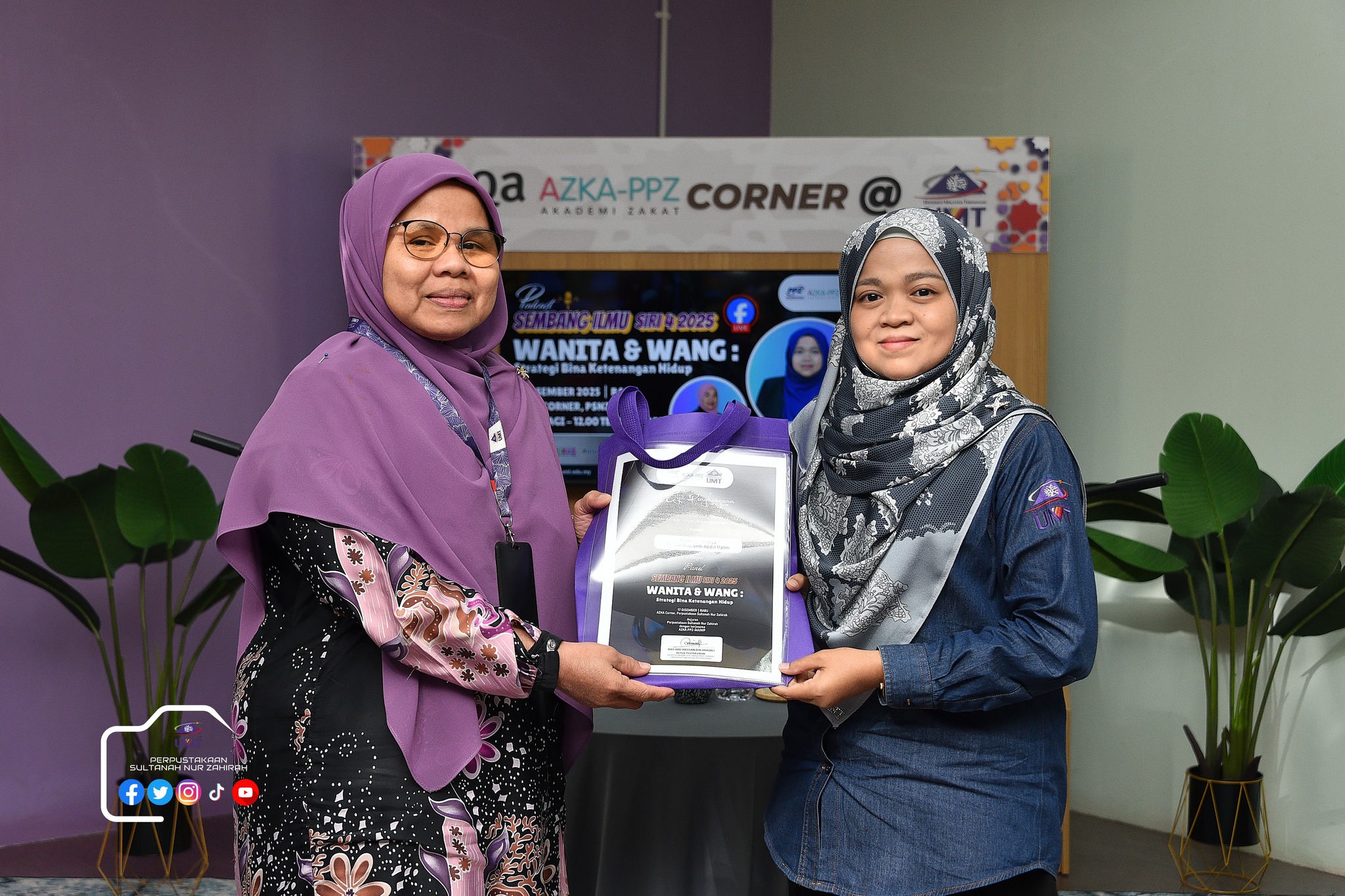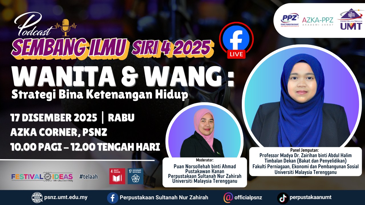 Perpustakaan Sultanah Nur Zahirah (PSNZ), Universiti Malaysia Terengganu dengan Kerjasama AZKA-PPZ MAIWP telah menganjurkan program bual bicara bertajuk “Wanita dan Wang: Strategi Bina Ketenangan Hidup”. Program kali ini menampilkan Prof. Madya Dr. Zairihan binti Abdul Halim, Timbalan Dekan (Bakat dan Penyelidikan), Fakulti Perniagaan, Ekonomi dan Pembangunan Sosial, UMT sebagai panel jemputan, bersama Puan Norsollehah binti Ahmad, Pustakawan kanan PSNZ sebagai moderator.